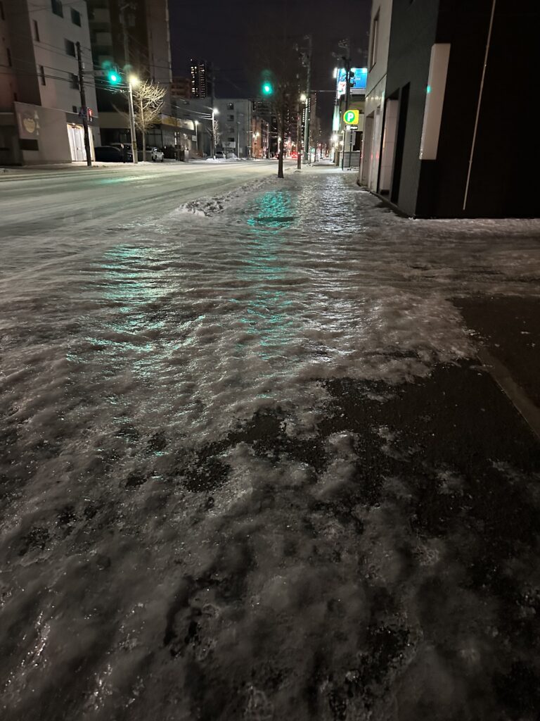 歩道の方が滑りやすかったです!ツルツルの路面になっていて冬履でも歩くのが大変な道路ですよね!通りすがりの子供が「スケートリンク!!」といってダッシュしてはいましたが、彼は特殊能力を持っているのでしょうw